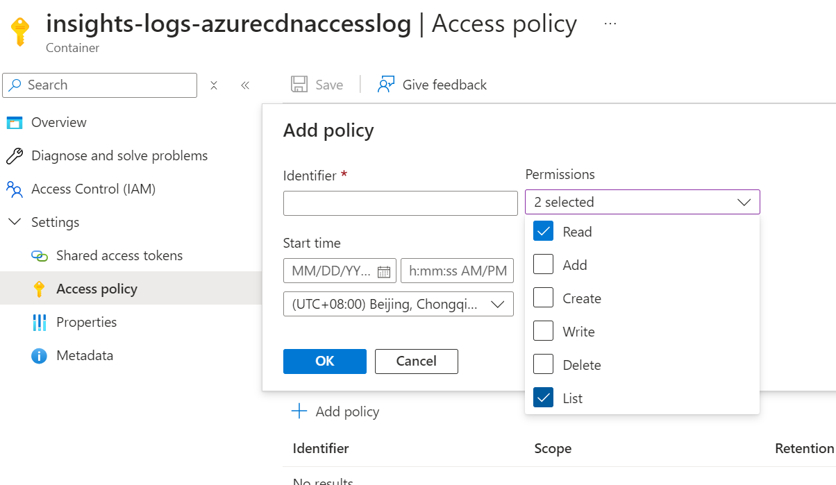 - 导航到一个Storage account 的 Container 下,选择要下载的 Container,导航到 Settings|Access policy 创建一个存储访问策略(Stored access policies),选择 读取 read 和 列出 list 权限,并起一个合适的标识符(友好名称,便于识别)