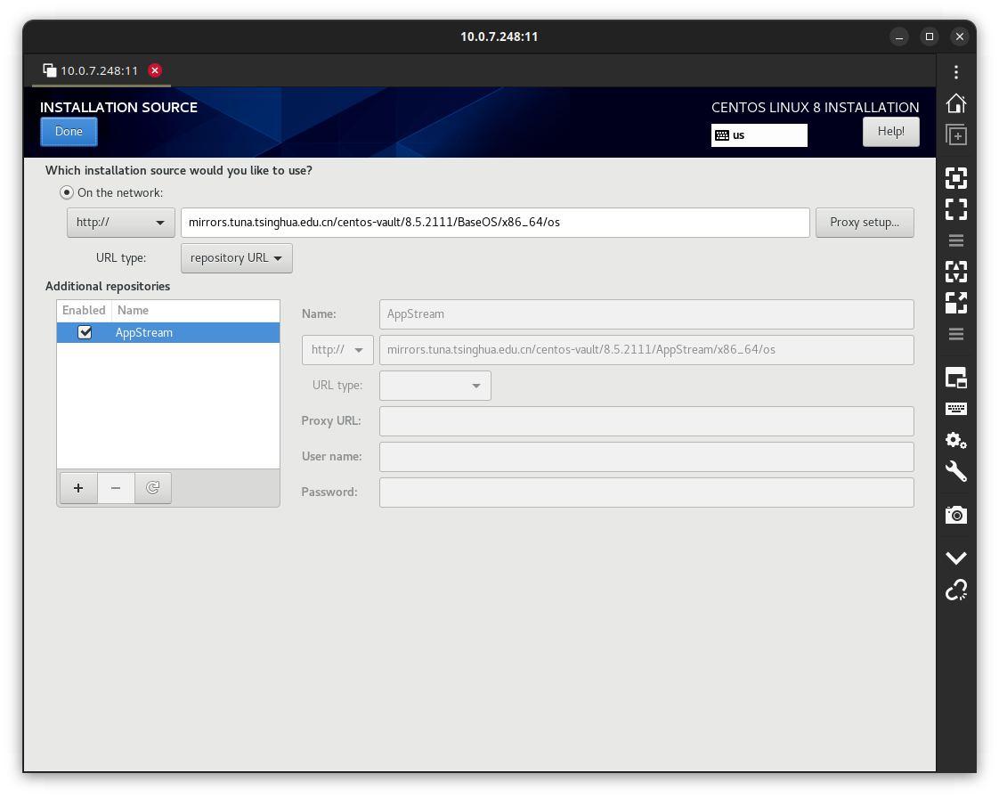 下面的截图是我用 Remmina 连接到 kvm 的 VNC 后到选择安装源步骤截取的。协议可以选https也可以选http,考虑到centos8的CA证书不一定能跟上所以此处选http协议(强迫症可能表示不满😎)。