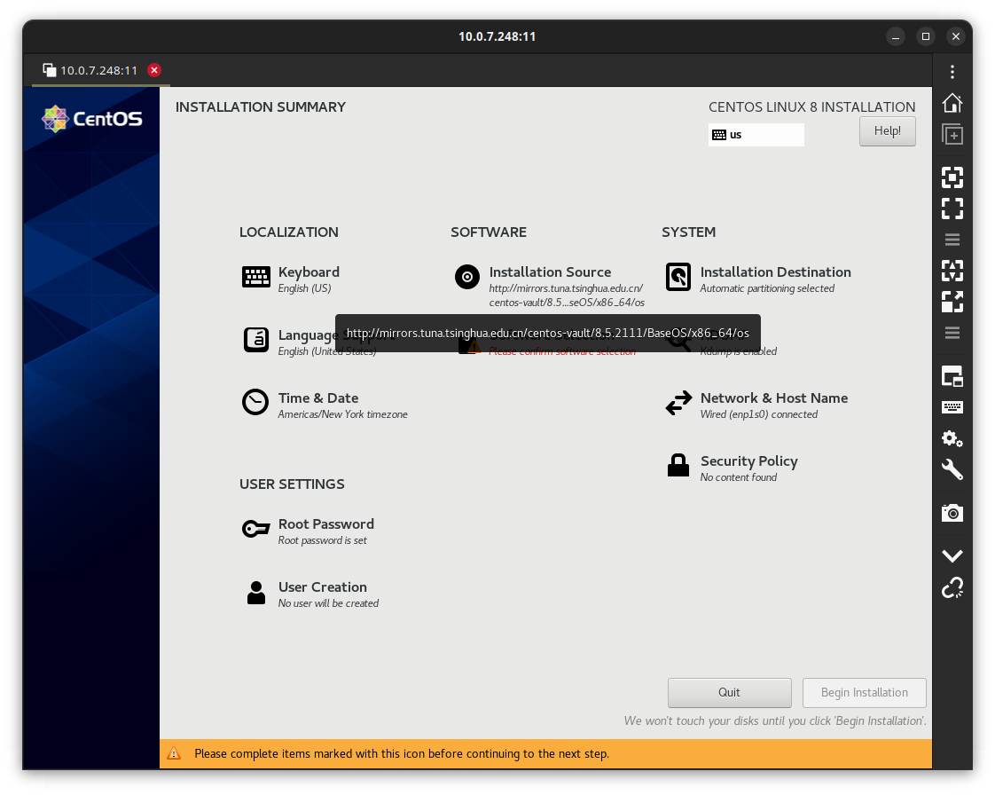 CentOS8 ISO下载地址有两种,一种是boot.iso,一种是dvd1.iso。这两个的区别在与大小和安装过程不同。boot.iso 不像 dvd1.iso那样有完整的安装源(安装系统所需的所有包),在正常启动后到安装配置(Installation Summary)界面会提示配置安装源(Installation Source),只有配置了安装源才能继续安装。而且boot.iso在安装过程中必须能访问网络(无论是Internet还是内部网络都可以,当然内部网络或者离线环境必须有软件源服务)。但boot.iso较小,只有 789.0 MiB,而dvd1.iso 是10.1 GiB。建议公网下载ISO时从清华大学tuna软件源下载,速度比较快。