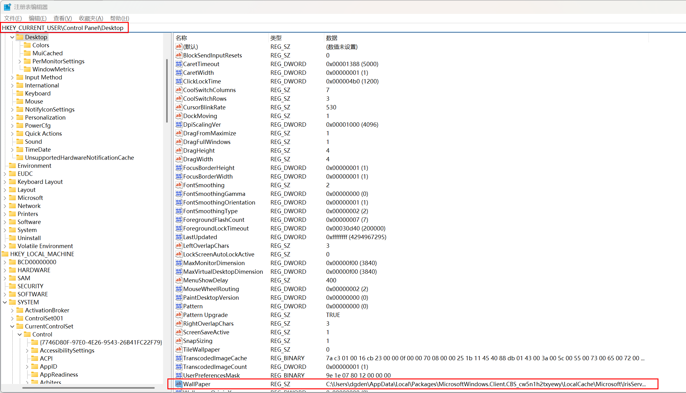 通过Windows搜索或者快捷键Windows + R输入“regedit”打开注册表编辑器,在地址栏输入“HKEY_CURRENT_USER\Control Panel\Desktop”,右侧找到名称为“WallPaper”的项,双击打开查看它的值,发现其值是“C:\Users\dgden\AppData\Local\Packages\MicrosoftWindows.Client.CBS_cw5n1h2txyewy\LocalCache\Microsoft\IrisService\8247854789252287045\133850423548493556.jpg”。