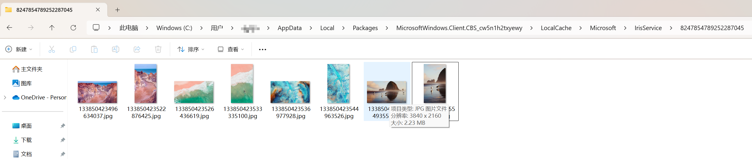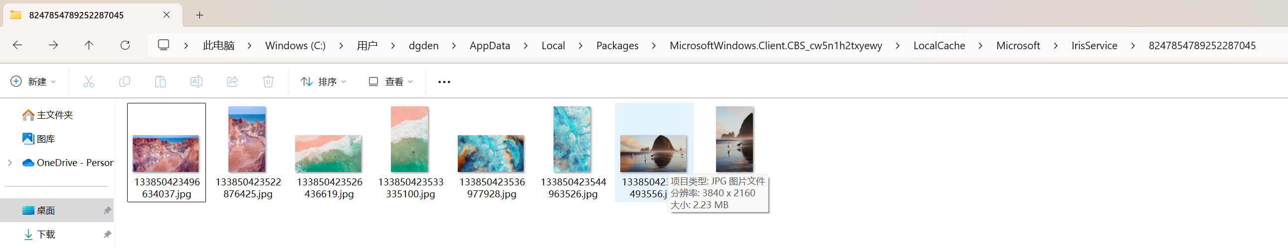 我们再通过资源管理器打开“C:\Users\dgden\AppData\Local\Packages\MicrosoftWindows.Client.CBS_cw5n1h2txyewy\LocalCache\Microsoft\IrisService\8247854789252287045”就可以查看到下面的图片文件了。