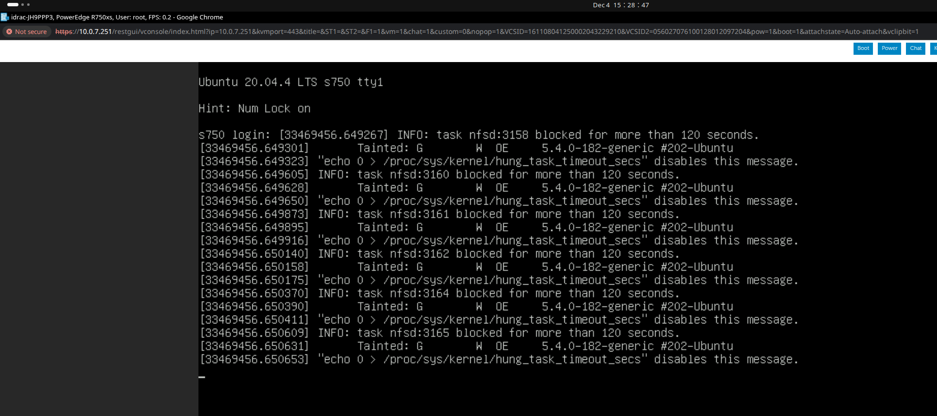 先在SSH界面中重新启动服务器,通过iDARC控制台发现并没有响应。过了大约半小时后,通过 iDRAC 冷启动服务器电源,服务器重新启动,问题消失,目前状态正常。