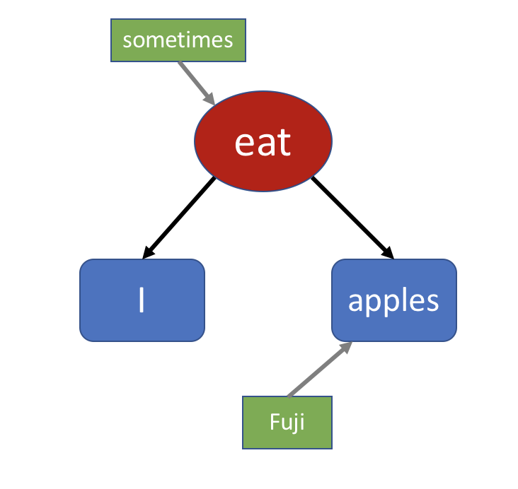 由于 sometimes 是修饰 eat 动作的频率,我们把它指向 eat 动词节点。