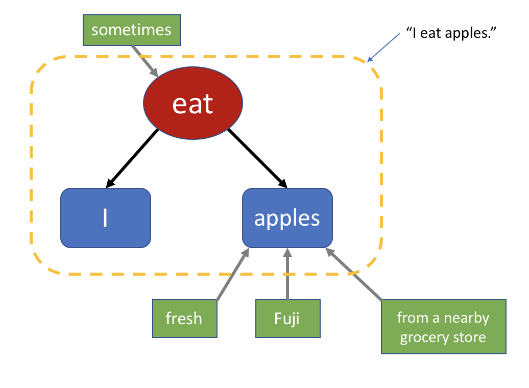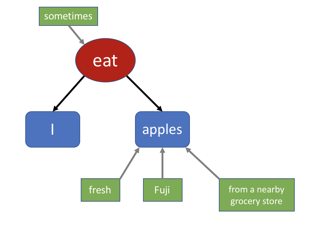 注意,主干“I eat apples” 本身就是一个语法正确的句子,它满足所有的语法规则。于是你理解了它在说“我吃苹果”。然后你返回去再看几遍,逐渐加上细节,知道是什么样的苹果,从哪里买来的,什么时候吃。