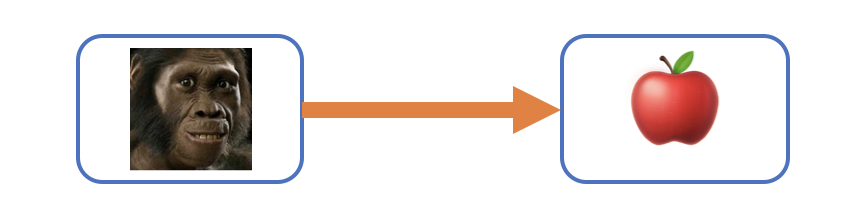 画图是很麻烦的,笔画太多不说,还可能有歧义。到后来,部落里的人聪明了一点,发明了“符号”这种东西,只需要几笔就能表示一个概念。他们给事物起了简单的符号名字,不再需要画图了。于是我们有了 I, apple 这样的词用来指代事物。有了 eat 这样的词,用来代表动作。所以画面变成这个样子: