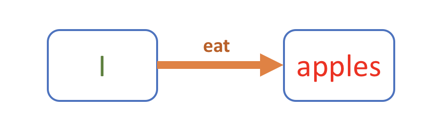 动词 eat 需要两个名词参数,我们给它 I 和 apples,就成了一个完整的句子。再次声明,我这里的“名词”,包括了像“I”这样的“代词”。