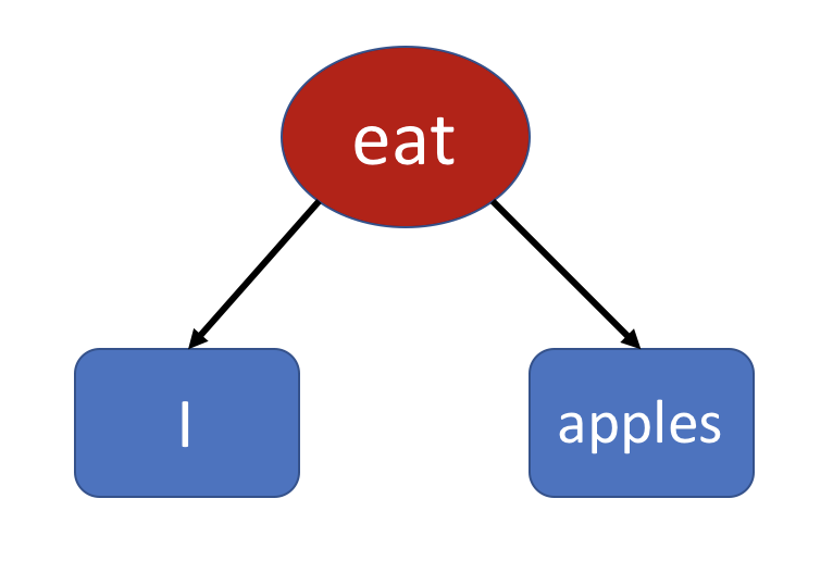 你可以把这个图看成是一棵倒着长的树。你把屏幕旋转 180 度,就会看到一棵树。树干 eat 发出两个“分支”,连接着它的两个参数:I 和 apples。为了表达清晰,我用红色圆圈来表示动词,而用蓝色方形表示名词。