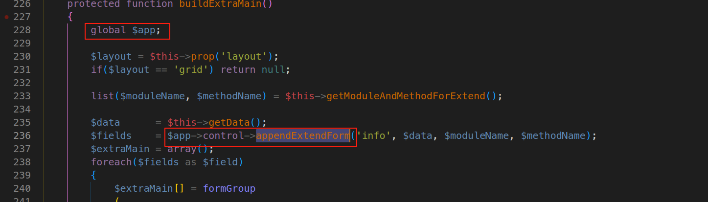 感悟起源 : 禅道框架在开始处理请求时先通过初始化一个router类的实例并设置为全局变量$app,这可以用来调用不同类中的方法。这种设计类似面向对象编程中“继承”的“组合模式”(在当前类中创建其他类的实例供当前类或子类使用)将不同的类塞入到router中。作为程序员我们知道我们通过子类继承父类扩展父类实现自定义功能,因此为了对extension类增加功能去定义 myextension 类扩展 extension类(其中 extension 扩展了 control,control 扩展了 baseControl)。原计划是在extension的子类myextension的构造器内判断是否需要执行其他方法并渲染视图(MVC中的V),以便在执行自身方法时先将执行流程转到这个视图处理一些前置条件(例如必须通过验证才能继续访问),于是我在myextension子类的构造器内执行了$this->display方法以便渲染这个视图来处理前置条件。结果测试发现这个视图执行到某个方法时报错,提示在router的control变量($app->control)下找不到appendExtendForm方法。这说明我不应该在构造器里执行display这个方法,那么为什么不能在构造器内执行this->display呢?思考轨迹 :