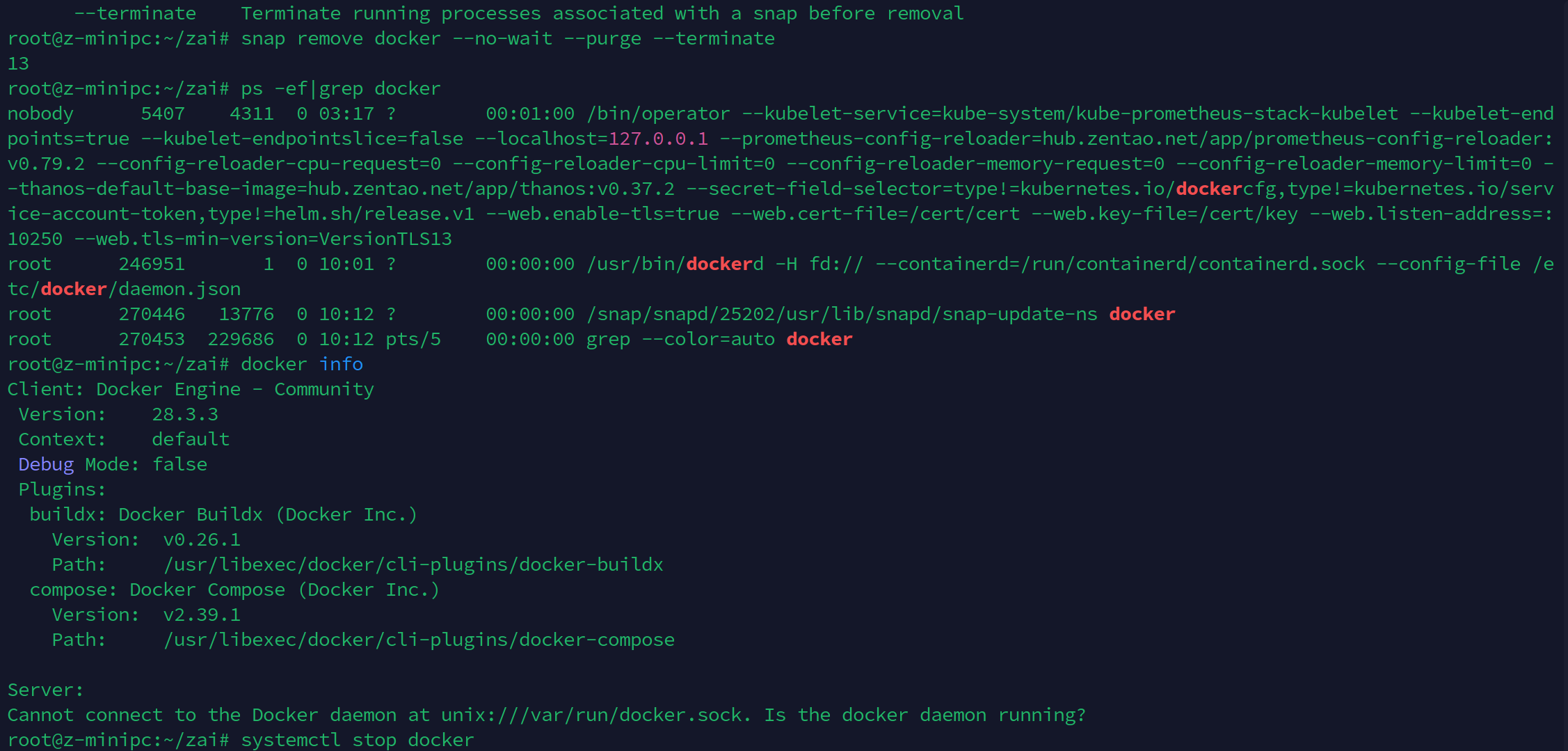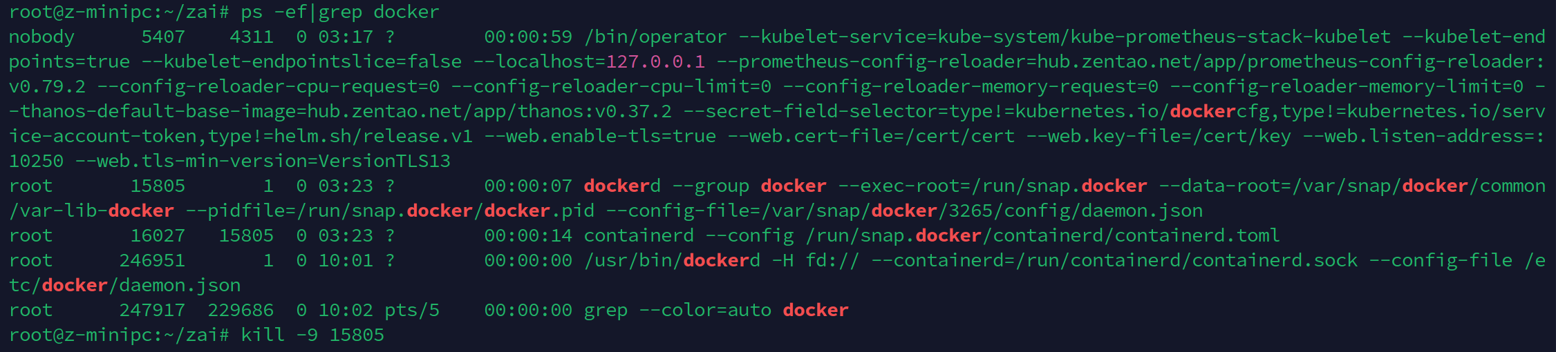 从结果可知,这个机器上运行有Kubernetes组件,且有两个 dockerd 进程,一个是我们常见的/usr/bin/dockerd进程一个是snap的dockerd进程,因此必须把snap这个干掉;